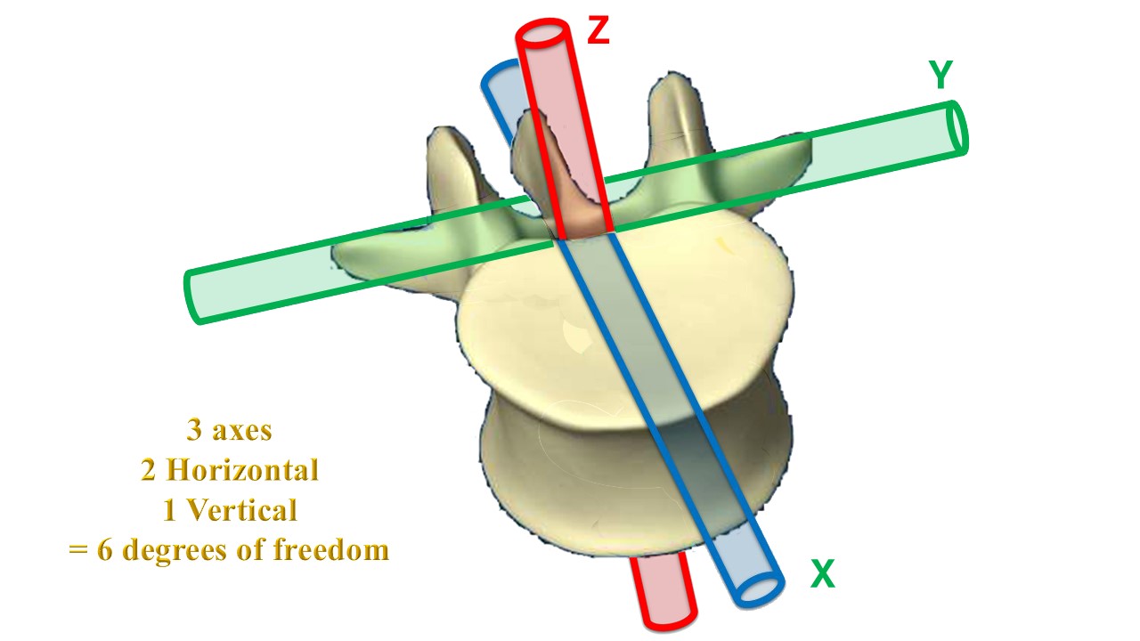 The movement between two vertebrae takes place along 3 axes: 2 horizontal; transverse (joining the transverse processes) and sagittal (in the axis of the spinous process) and 1 vertical (in the axis of the spinal cord), The intervertebral movement therefore has 6 degrees of freedom at each of the 17 thoracic and lumbar levels . |