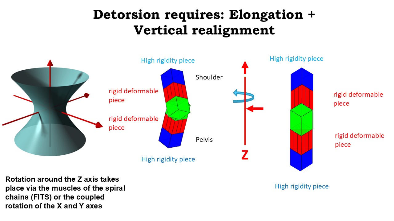 The concept of mechanical detorsion is linked to coupled movements of the spine. The combination of sagittal isostatic balance, frontal correction by bending or shifting, and bringing the vertebral bodies closer to the vertebral axis by the “mayonnaise tube effect” automatically generates mechanical detorsion. The description of the object in our 3 dimensional space precedes the step of measuring this object. |
