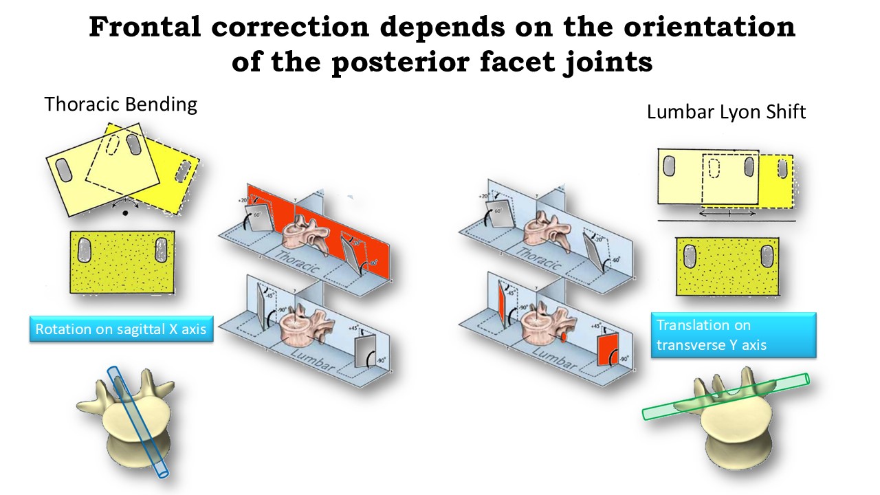 Mechanical detorsion and derotation are conditioned by the orientation of the posterior joints. In the Lyon method, at the thoracic level, it is a rotation around the sagittal horizontal axis or "bending". At the lumbar level, it is a translation along the horizontal transverse axis or "shift". In the absence of associated axial elongation, some schools also propose the shift at the thoracic level.