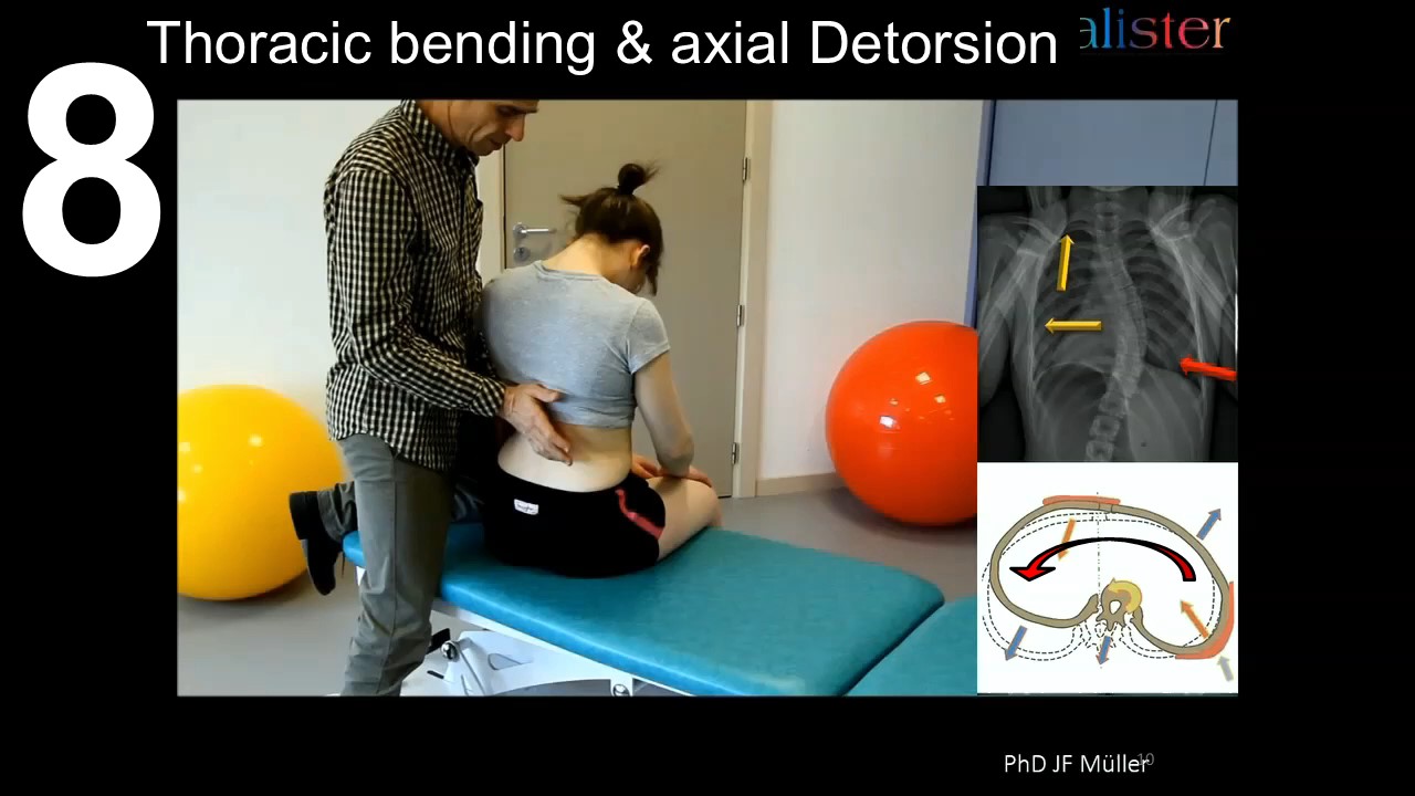 In the event of significant rigidity, active work is complemented by passive mobilization in thoracic kyphosis, followed by frontal bending. Mobilization can also be completed with axial detorsion. |