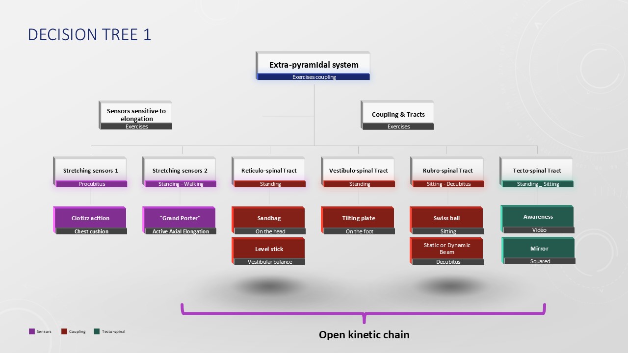 The Lyon Method of physiotherapy is intricately designed around the extrapyramidal postural system. This system's static and dynamic receptors are highly responsive to stretching stimuli. Techniques such as flat-back kyphotization and active axial self-elongation serve to activate these receptors effectively. Within the framework of braces, exercise number 10 employs ballistic stretching on a Swiss ball, which aids in recalibrating the corrected posture. The extrapyramidal system itself is composed of four tracts, each of which can be activated both statically and dynamically, and interestingly, they can be stimulated independently. For instance, the reticulo-spinal tract is engaged by balancing a small sandbag atop the head while maintaining an upright stance. Meanwhile, the vestibulo-spinal tract is activated through the use of tilting trays. In contrast, the rubrospinal tract is stimulated by experiencing significant imbalances while positioned on a Swiss ball. Lastly, the tecto-spinal tract is influenced through the employment of an osteopathic mirror, typically around the age of nine.