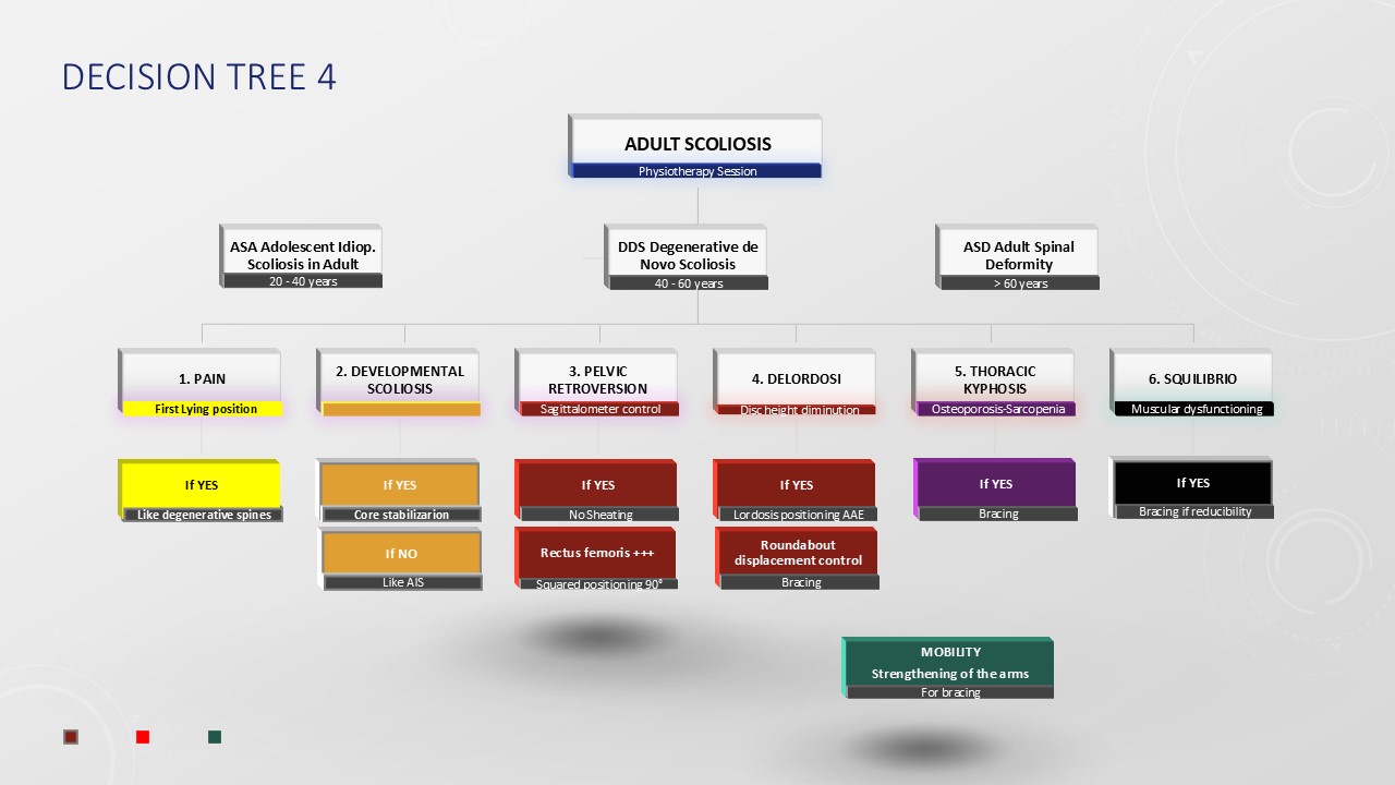 When assessing adult scoliosis, the age of the patient at the initial consultation serves as a crucial indicator of the scoliosis type. For individuals under the age of 50, scoliosis often represents the progression of adolescent scoliosis. Conversely, beyond the age of 50, de novo scoliosis tends to be more prevalent. Once a patient reaches the age of 70, significant imbalances, such as camptocormia or Pisa syndrome, may necessitate the use of a walker. Our analysis has categorized pain based on age and its location within the body. The progression of angular deviation can be mitigated by core exercises conducted in both the frontal and sagittal planes. Engaging in fitness routines that bolster the abdominals and gluteal muscles promotes pelvic retroversion, while physiotherapy targeting the quadriceps rectus femoris enhances anteversion. It is advisable to refrain from sports activities that induce lordosis, and instead, focus on adjusting one's sitting posture at a computer to minimize strain. Osteoporotic high thoracic kyphosis can lead to a forward shift in the center of gravity. Therefore, exercises should be practiced in a closed kinetic chain, with the hips flexed at a 90-degree angle.