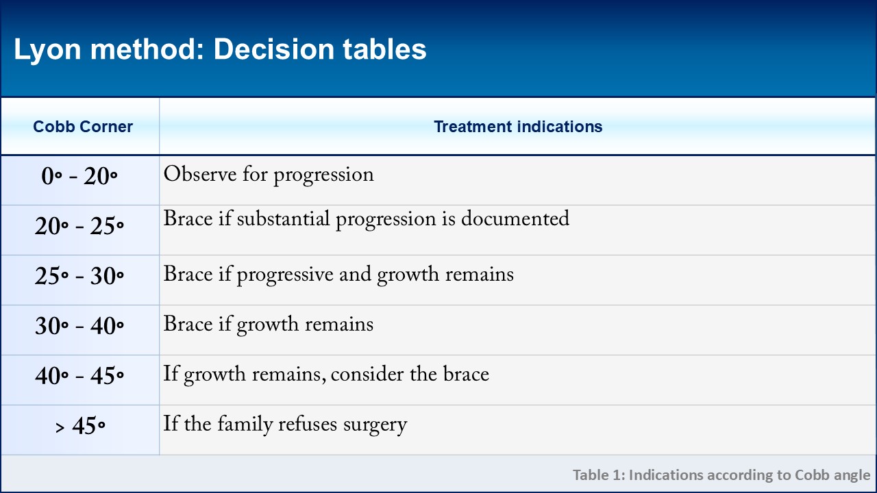 The Cobb angle measurement continues to be regarded as the "gold standard" in determining therapeutic indications for scoliosis, even with the inherent inaccuracies of a frontal plane projection. Remarkably, the primary criteria for these indications have remained largely unchanged for over half a century. Nonetheless, the concept of growth invites further discussion. In contemporary practice, greater emphasis is placed on bone mass rather than growth alone, as bone mass peaks following the cessation of growth and significantly influences the strength of the vertebral body. Consequently, the Lyon method opts to address scoliosis post-Risser 3, incorporating a gradual reduction of brace wear towards the conclusion of treatment.