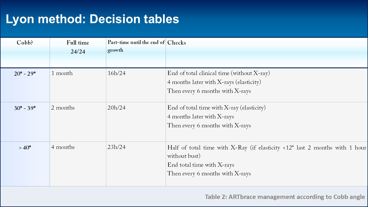 In instances where the use of a brace is recommended, the Lyon method distinguishes between full-time and part-time usage. Full-time brace wear replaces the previous period of plaster casting and is essential for inducing plastic deformation in the paravertebral ligament structures. The duration of full-time wear can range from one to four months, contingent upon the initial Cobb angle. Similarly, the initial prescription for part-time brace wear is based on the Cobb angulation, with further adjustments made according to the curvature's reducibility and elasticity. Reducibility is defined as the variation between the initial angulation and the angulation experienced while wearing the brace, typically averaging at 70% for the ARTbrace. When a curvature displays lower reducibility, this suggests a greater rigidity, thereby requiring an extension in partial wearing time. Elasticity, on the other hand, is calculated as the difference between the in-brace angle and the angle observed after at least one hour without the brace. On average, elasticity is recorded at 12°. Should the elasticity exceed 12°, an increase in the duration of brace wear may be warranted.