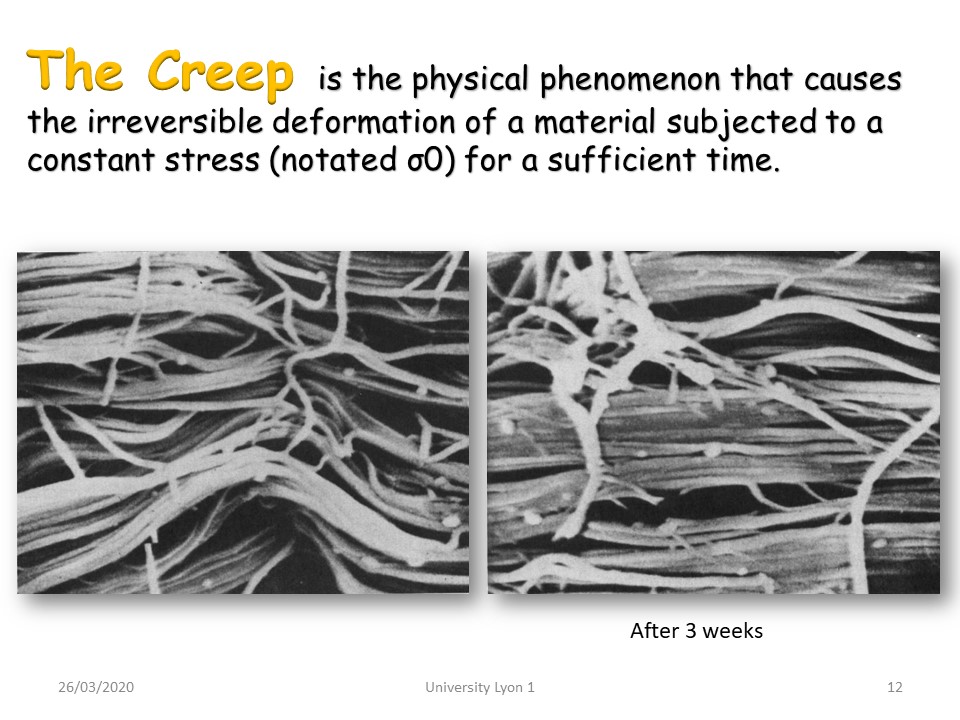Creep is the physical phenomenon that causes the irreversible deformation of a material subjected to a constant stress (denoted σ0) for a sufficient period of time. A ligament is under tension under a certain stress. The soft tissue stretches quickly initially, then continues to stretch more slowly. When a constant directional stress is exerted with a plaster cast, it causes a flow of the soft tissues in the appropriate direction. After 3 weeks, collagen fibers are progressively aligned to conform to the original structure. Clinically, about 4 weeks of immobilization are necessary.
