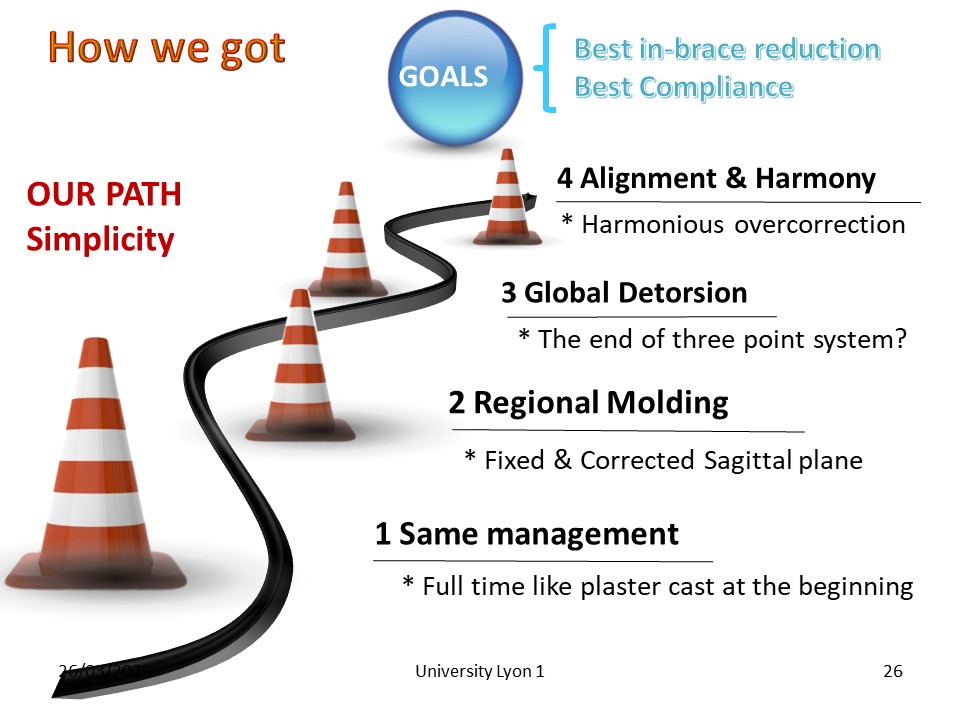 Although older designs have proven effective (Weinstein 2013), the new concepts are able to improve the correction and tolerance of the brace which is a fundamental factor of compliance. We will detail besides Asymmetry, Rigidity and Detorsion: 4. ultra-simple classification. 5. the change of geometry with passage of the system 3 points to the geometry of the solids. 6. A new methodology: digital transformation with digital cast. |