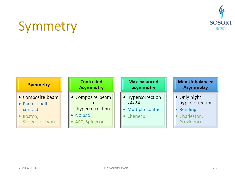 SOSORT BCSG has classified asymmetry into 4 categories: 1. Symmetrical braces like the Boston brace. 2. Controlled asymmetric braces like the ARTbrace we are studying. 3. Braces with maximum asymmetry : Chêneau like braces. 4. Night Asymmetrical braces with off-axis head, like Charleston brace. |