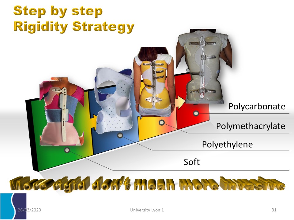 SOSORT BCSG has specified the rigidity criteria that depend on the thickness of the plastic. This is why other simple criteria have been chosen. 1. Tissue. The contact is permanent with the skin. 2. Rigidity with intermittent contact areas. 3. Overall rigidity, allowing opening for fitting. 4. High rigidity. Opening is done as a book with hinges on a posterior metal bar.