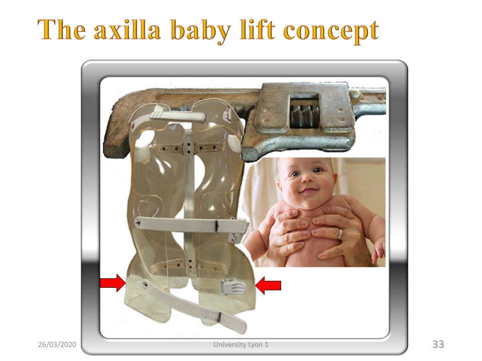 The Lyon brace, heir to a long tradition of nearly 200 years, was the first adjustable “under-arm” brace made of leather-steel, 70 years ago. It followed a reductive plaster cast and was intended to maintain this reduction. Leather has been replaced by high-rigidity polymethacrylate and more recently by polycarbonate which replaces the plaster cast, as demonstrated by Negrini.
