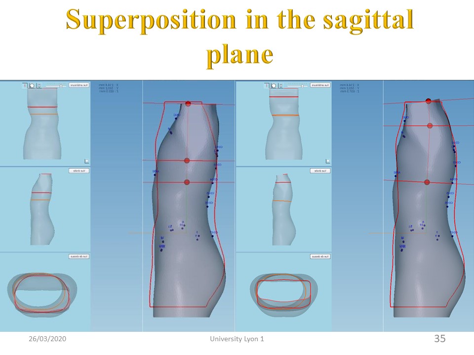 The same procedure is applied in the sagittal plane. On the left of the picture: in red, the molding n ° 1 in hypolordosis and in gray the lumbar correction with molding n ° 2 in physiological lordosis, On the right of the picture: in gray the final brace with correction of the thoracic flat-back with, in red the molding n ° 3 in physiological kyphosis. All these procedures are performed using a professional software, allowing changes with constant volume. |