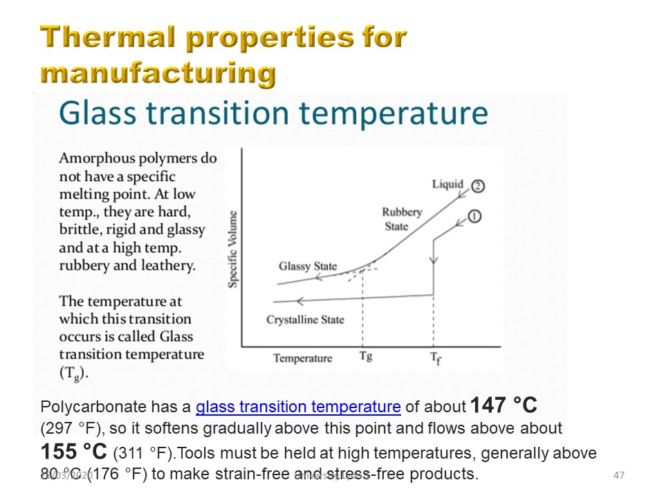 The major difference with other plastics is the very precise glass transition temperature, which requires thermoforming near the oven and a constant temperature in the thermoforming room. Polycarbonate has a glass transition temperature of about 147 °C (297 °F), so it softens gradually above this point and flows above about 155 °C (311 °F).Tools must be held at high temperatures, generally above 80 °C (176 °F) to make strain-free and stress-free products.