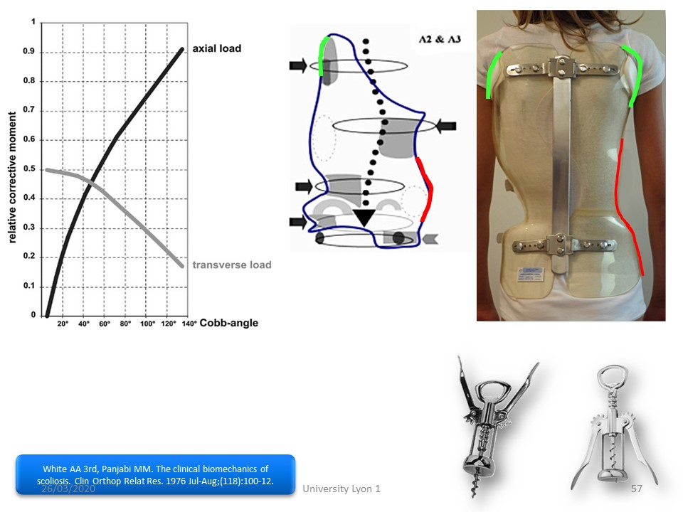 White and Panjabi published in 1976 the action of the forces necessary for the correction of scoliosis according to the angulation. For an angulation of less than 40 °, the frontal forces are the most corrective. When the angulation exceeds 40 °, the translation along the vertical axis becomes the most effective.
