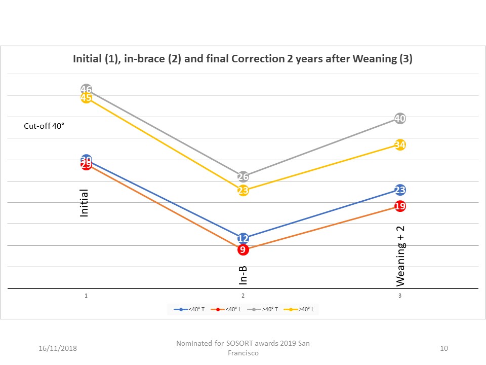 Results The 110 patients had an initial mean age of 13.45, The initial mean angulation is: 29.9°, The average in-brace angulation is: 8.83, The average angulation at 6 months without brace is: 17.3, The average angulation two years after weaning is: 19.1°; The average In-brace correction percentage is 73%, the definitive average correction 2 years after brace weaning is 36%.