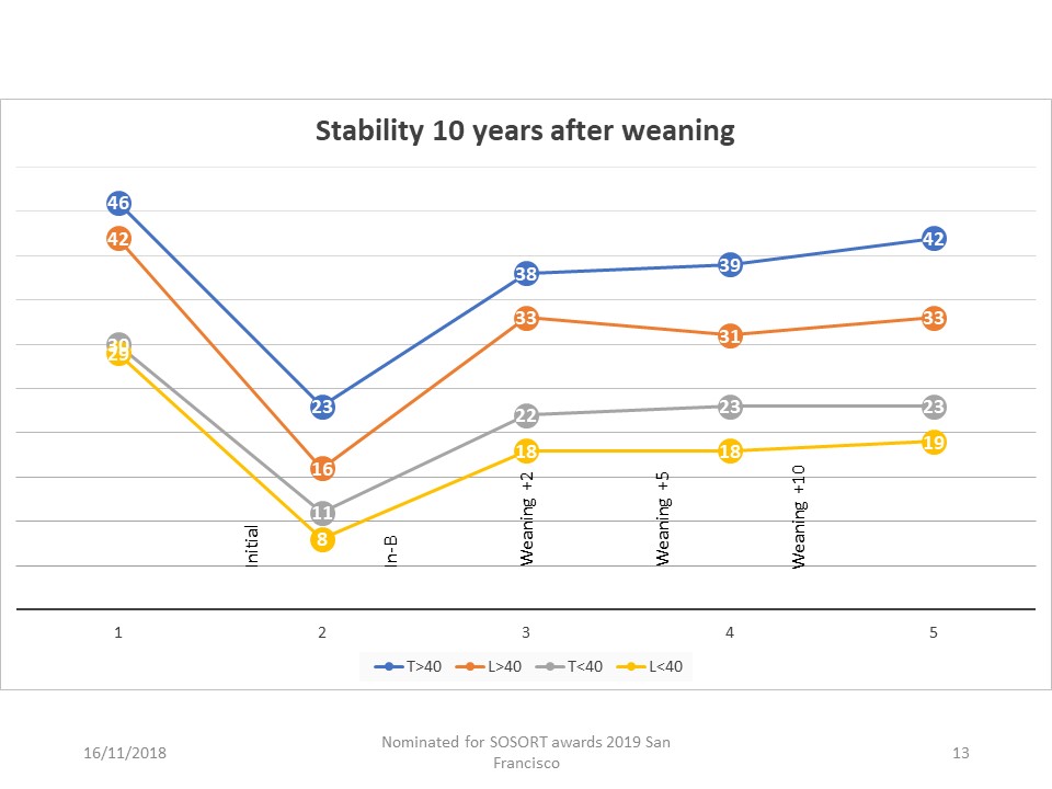 A second part of this study concerns long-term stability. 99 patients were seen 10 years after brace weaning. The curve is identical to that of the general statistics and perfect stability for 10 years is observed.