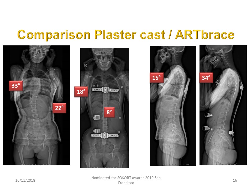 The objective is to check if a plaster cast and/or a hyper-corrective brace can be effective at the end of growth. The Lyon brace and especially the Artbrace having a large contact surface with the trunk reduces the load on the spine by the effect of composite beam. The recentering of the disc by night hypercorrection also facilitates load reduction during the day. The readjustment of ligament tensions by plastic deformation characteristic of the initial period of full time is also a positive factor.