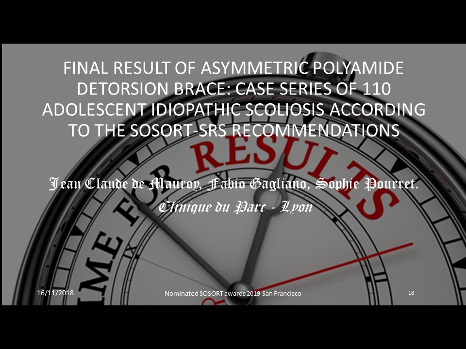 Final result of asymmetric polyamide detorsion brace: case series of 110 ADOLESCENT IDIOPATHIC scoliosis according to the SOSORT-SRS recommendations. Background: The initial plaster cast allows plastic deformation or creep of the soft tissues surrounding the vertebral body. Polyamide can replace cast and be used throughout the treatment, especially if it is asymmetrical. The association asymmetry and high rigidity is the most corrective in the frontal plane. It is the coupling of this frontal correction and the restoration of an isostatic sagittal balance thanks to the regional block moulding which performs the Detorsion. The brace is like a bobsleigh track in the opposite direction to the torso column replacing the 3 points system by a global soft contact.