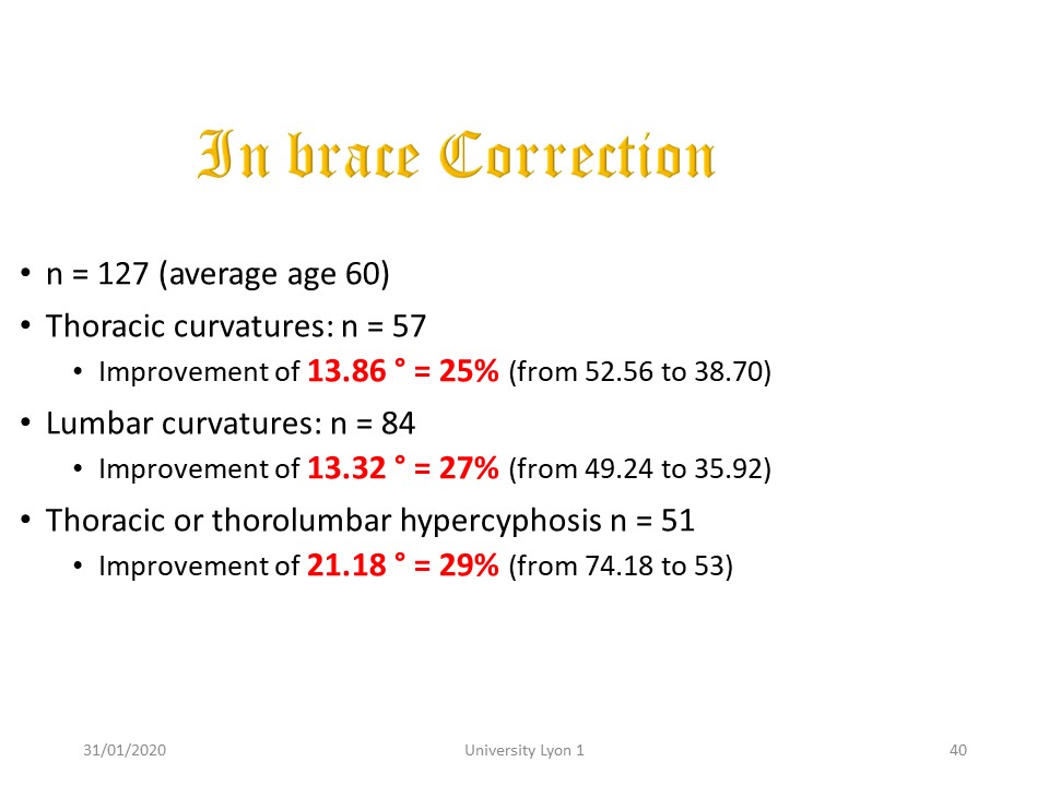The orthopaedic results of in-brace correction are significant with approximately 25% of correction on thoracic and lumbar curvatures, but especially 30% of correction on kyphosis from 74 ° to 53 °, while the average is 45 ° in the normal population. This result is all the more interesting as the defect of the old polyethylene brace was the insufficient correction in the sagittal plane.