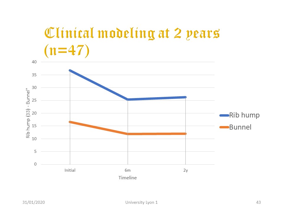 At Risser 3-5, the total time is identical, because it is at the soft tissue level that we work. It is no longer a question of guiding growth. The wearing time for the first 6 months is also identical to that of the protocol before Risser 3, however the progression of the ablation time during the day (4 hours every 6 months) no longer depends on the end of growth. The average duration of treatment varied from 18 to 30 months if the initial angulation exceeded 40°. We can therefore specify the duration of the treatment from the day of the consultation. All classical parameters have been studied, but only Cobb (gold standard) angulation will be presented.