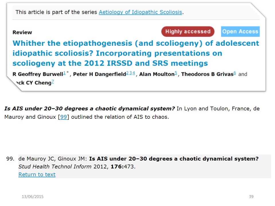 Scoliosis is the concrete materialisation of the chaos theory applied to the spine. The system is : 0pen (standing position, exchange with the outside), Non predictive (butterfly effect), Complex (multifactorial), Discontinuous (steps), Deterministic (not by luck), Patternable (4th fractal dimension), with a Strange attractor, and Change of physiological behaviour at puberty time. |