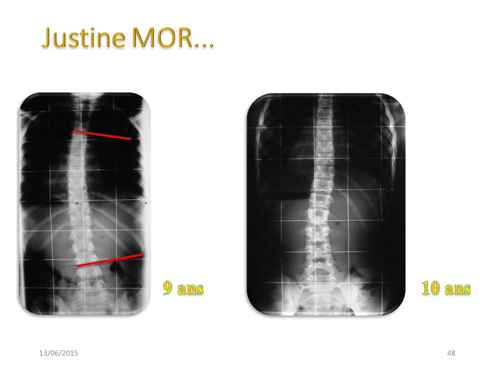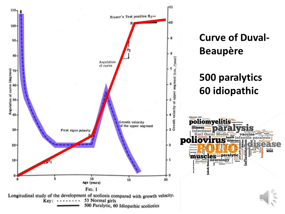 At this stage, all etiological considerations no longer affect the course of scoliosis. Scoliosis is considered idiopathic when there is no disease associated with scoliosis. But the etiology of scoliosis does not affect linear scoliosis as we see on the Duval-Beaupère diagram, which had been carried out initially from polio scoliosis and confirmed secondarily for idiopathic scoliosis. |