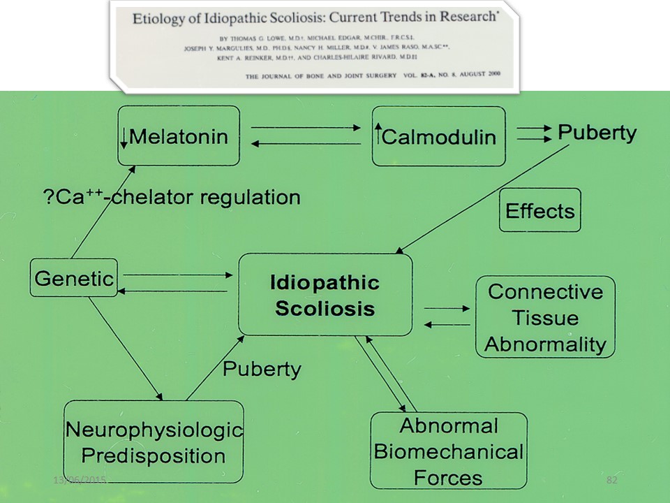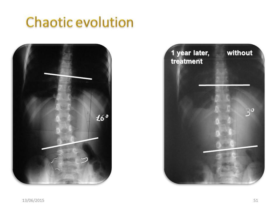 The etiology of the scoliosis is multifactorial and complex. When we gather in a computer the diferent characteristic of a progressive scoliosis, the flat back, the rotation, the hyperlaxity and the balance disturbance… with none of those characteristics we can predict the evolution of the scoliosis. Only an angle above 25° is a characteristic of progressive scoliosis, but we are not anymore in a chaos phase. |