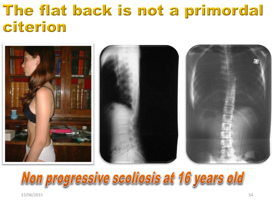 The occurrence of scoliosis or a flat back characteristic of scoliosis is not linked to chance. The flat back always accompanies the most progressive scoliosis, but we have seen that a flat back can exist without scoliosis. |