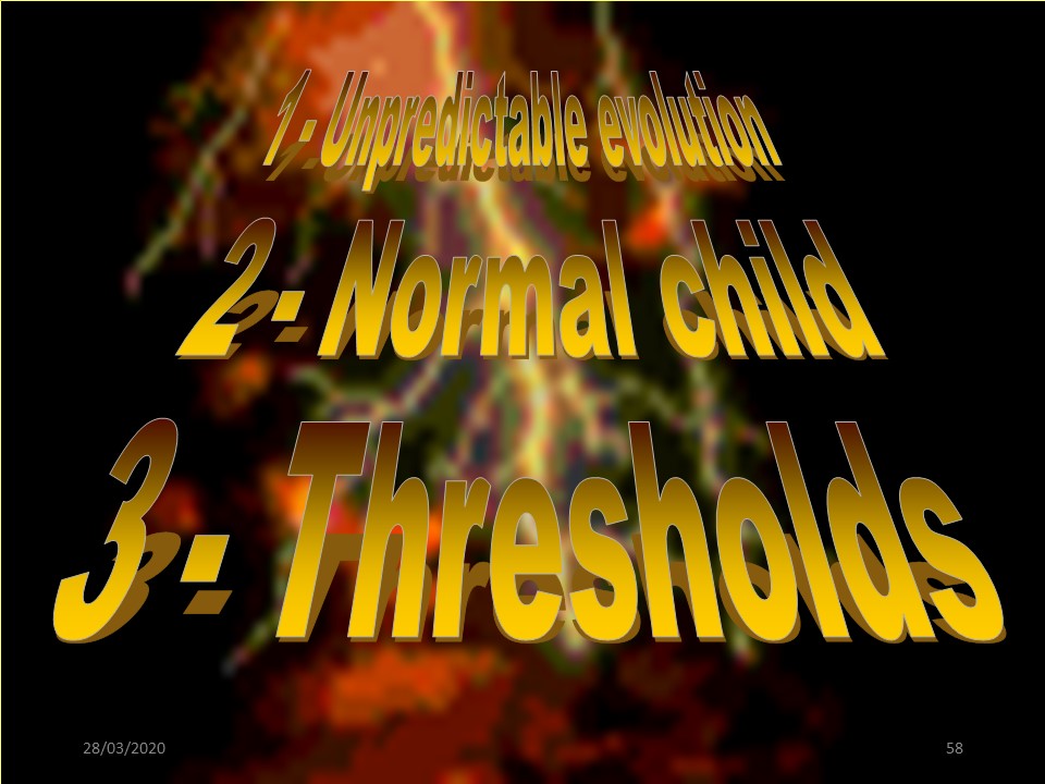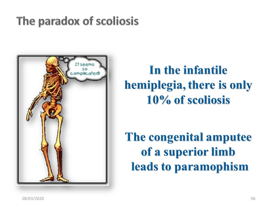 The paradox of chaos theory is that scoliosis occurs very frequently in a "normal" child. Currently, we often see progressive scoliosis with postural disorders that we have studied in the etiological chapter. But a major imbalance such as infantile hemiplegia will only cause 10% of evolutive scoliosis. |