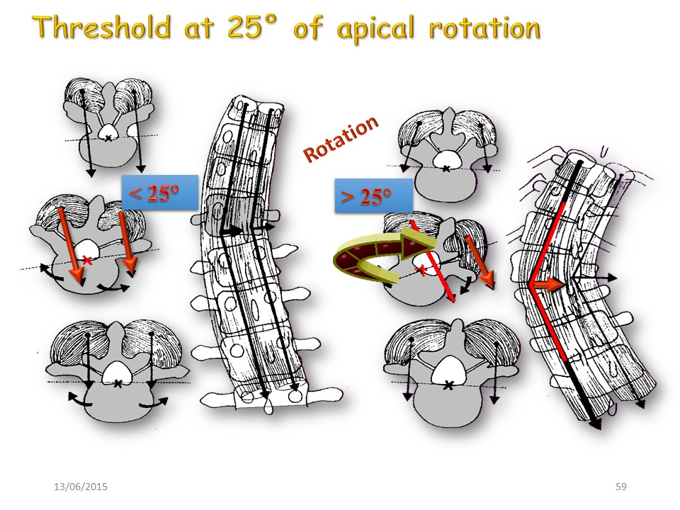 Indeed, it is then a mechanical problem, with successive or simultaneous involvement of: 1. the asymmetry of paravertebral tension, 2. the asymmetrical growth of the apical vertebra. 3. the intervertebral disc asymmetry. |