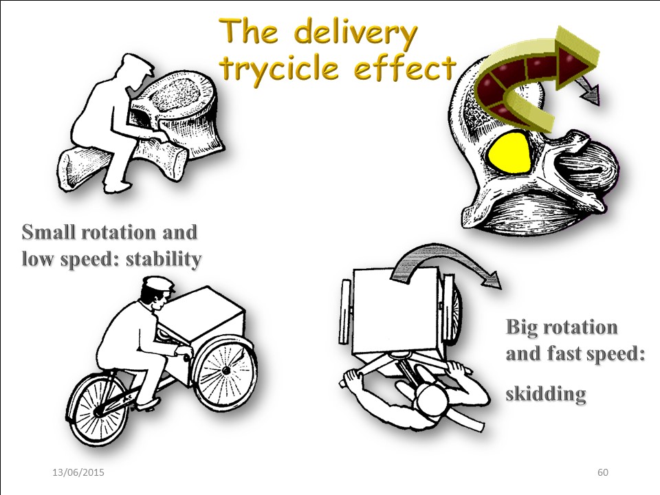 Besides the apical rotation, another discontinuity can occur in terms of speed. When the speed of the anterior flexion of the trunk is important, the vertebra skids like a delivery tricycle in a curve. This is why the anterior flexion movement of the trunk should be carried out slowly in scoliosis. |