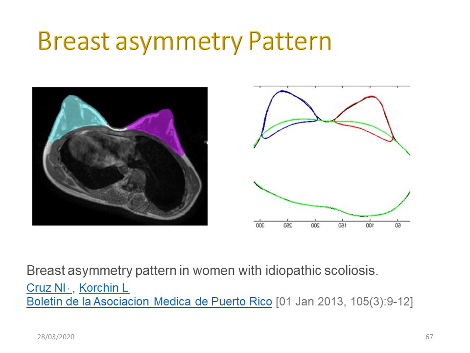 In addition to the thoracic deformity with anterior chondro-costal projection on the side opposite the rib hump, there is also a breast asymmetry. Women with idiopathic scoliosis consistently present breast asymmetry that followed a predictable pattern. The breast on the side of the convex thoracic scoliosis curve is always smaller in volume. The affected side also presents a smaller areola, a higher position of the nipple and a higher position of the inframammary fold when compared to the opposite breast. Though the asymmetry is predictable, the degree to which the patient presents these changes does not correlate with the severity of the scoliosis. |