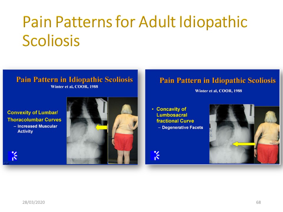 Idiopathic scoliosis pains in adults are characteristic. The main ones were described by Winter in 1988. The convexity pain is of the muscular type, the concavity pain is of the posterior articular type. A more complete description will be detailed in the adult scoliosis module. |