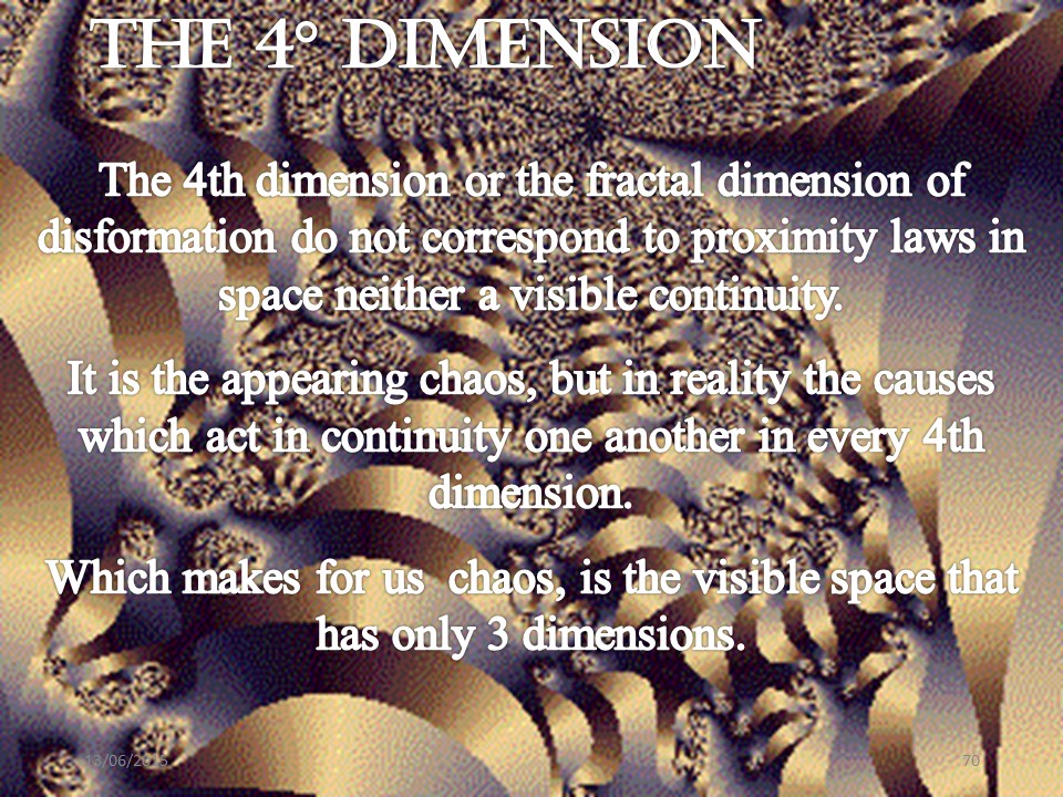 The 4th dimension or the fractal dimension of deformation do not correspond to proximity laws in space neither a visible continuity. It is the appearing chaos, but in reality the causes which act in continuity one another are in a 4th dimension. Which makes for us chaos, is the visible space that has only 3 dimensions. |