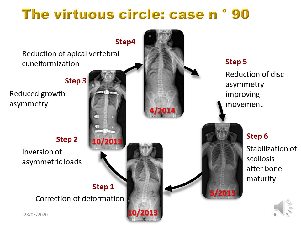 In order to obtain a virtuous circle, all the steps must be taken in the opposite direction: Rebalancing of the paravertebral tensions, inversion of the loads at the level of the apical vertebra, reduction of the disc asymmetry and stabilization at bone maturity. It is not only a matter of guiding growth, but of overcorrecting the curvature and maintaining the brace day and night. |