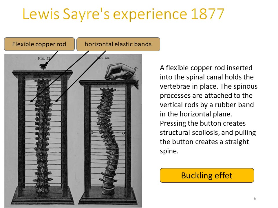 Lewis Sayre’s experience dates back to 1877. One flexible copper rod inserted into the spinal canal formed a vertical axis and held the vertebrae in place. Thorny processes are fixed to the walls by an elastic band in the horizontal plane. Pressing pulsating if creates a structural scoliosis, and pulling pulsating if creates a straight column. The horizontal plane and the vertical axis are therefore fundamental in the constitution in the reduction of scoliosis. |