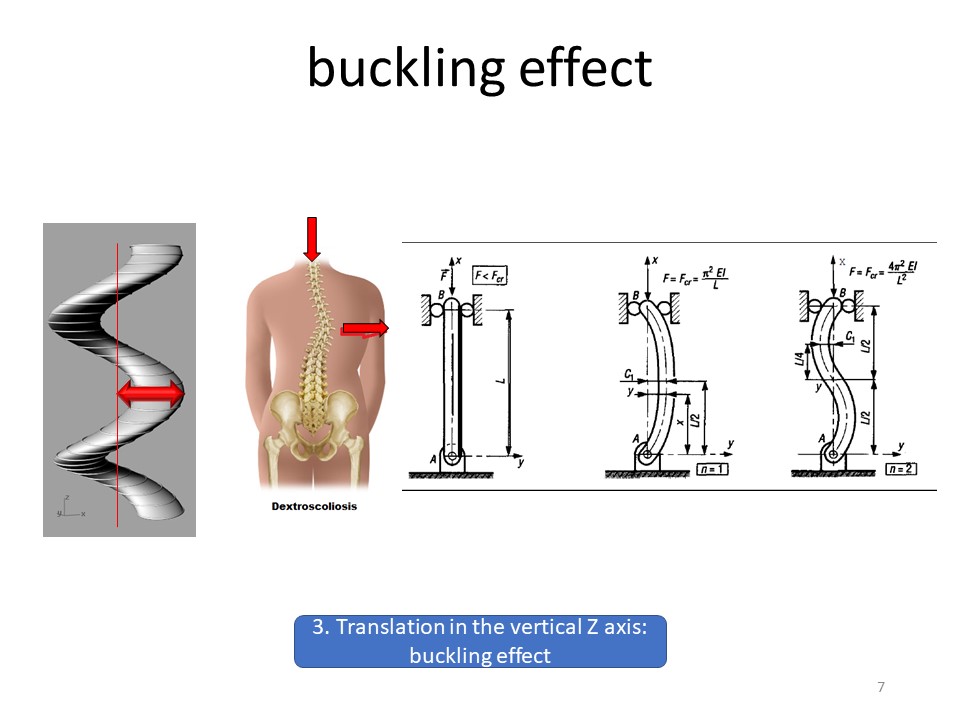 Mathematically, it is possible to calculate the buckling effect in the case of a deformation to a curvature or a deformation to two curvatures. If axial compression promotes scoliosis, the pulling effect along the axis goes in the direction of scoliosis correction. This is what the ARTbrace produces by the baby lift and the two-arm corkscrew effect. |