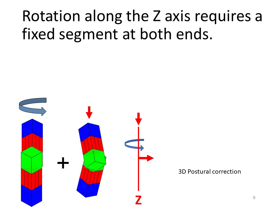 This is a rotation along the Z axis of the entire vertebral region. For anatomical reasons, this rotation along the Z axis will be maximal if the sagittal plane is in isostatic balance and if the corrective movement in the frontal plane takes into account the orientation of the posterior facet joints. |