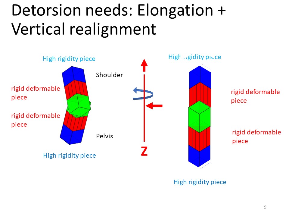 The plane geometry even in the 3 arbitrary planes of space is a picture that does not facilitate the reconstruction of volume by our brain. In solids geometry, detorsion can only be achieved if the ends are fixed. In the Lyon method, the pelvis and shoulders have always been considered as fixed points and stabilized by the brace. The column will be pulled between these two fixed points, it is the geometric detorsion and the apical vertebra will be pushed back on the midline, it is the mechanical detorsion. |