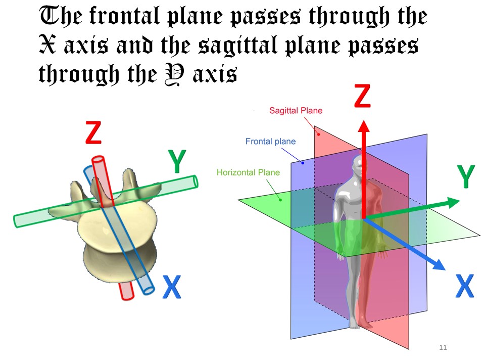 The movement between two vertebrae takes place along 3 axes: 2 horizontal; transverse Y (joining the transverse processes) and sagittal X (in the axis of the spinous process) and 1 vertical Z (in the axis of the spinal cord), The intervertebral movement therefore has 6 degrees of freedom at each of the 17 thoracic and lumbar levels. |