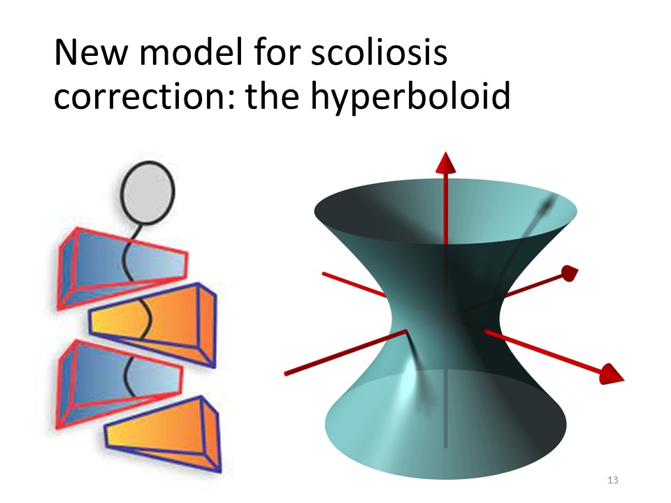 Scoliosis is a tridimensieonal deviation. All methods to date use a 3-point correction in plane geometry. Being a vertebral torsion and a cylindrical trunk, the plane geometry is difficult to use, which is why the Lyon method uses the volumetric geometry of solids with a new modeling of the trunk of hyperbolic type closer to reality. |