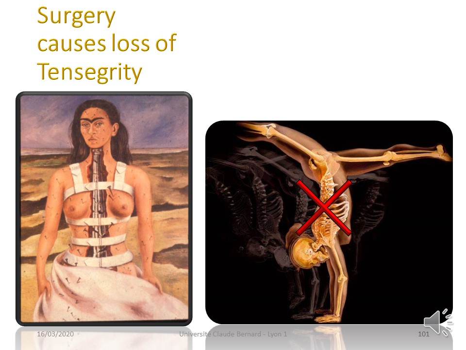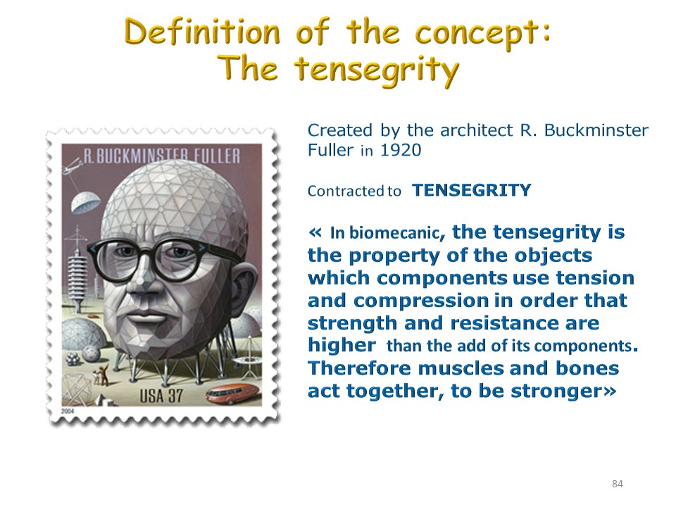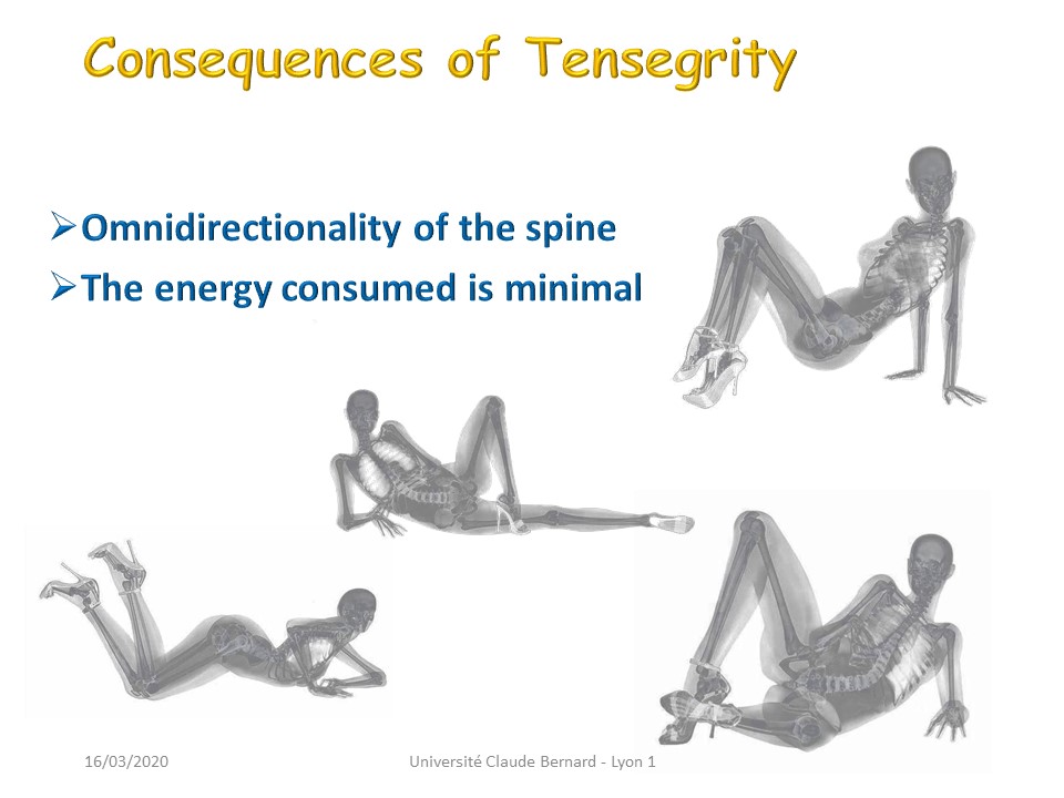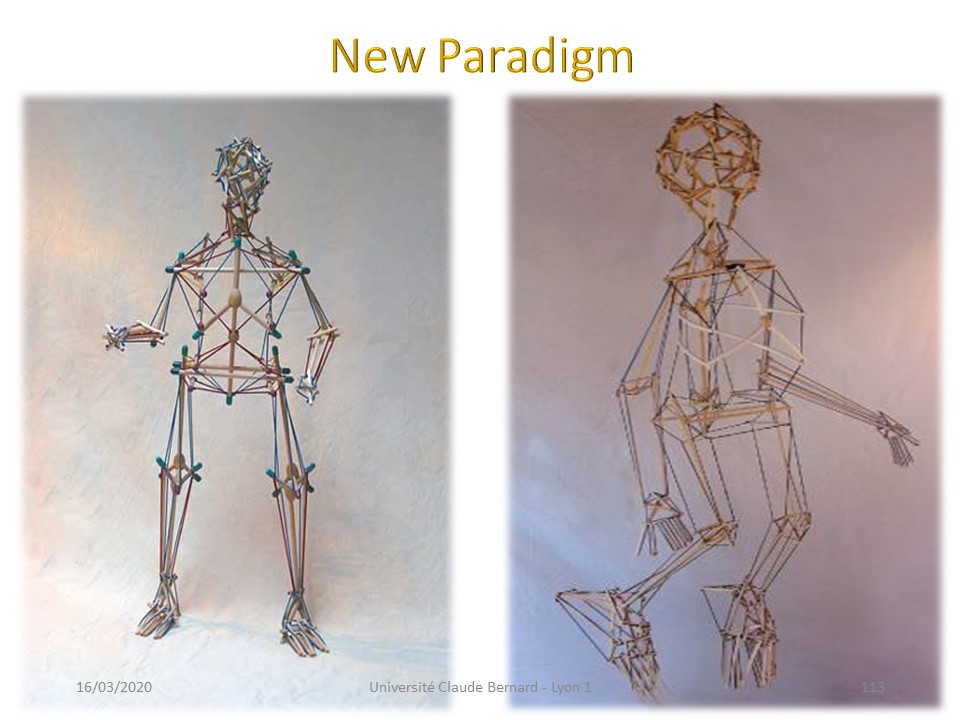 It is the whole organism from the cell to the fascia passing through the skin which constitutes a structure of tensional integrity. The 206 bones work in discontinuous compression, they are hoisted against gravity by the continuous tension of fasciae and ligaments. |