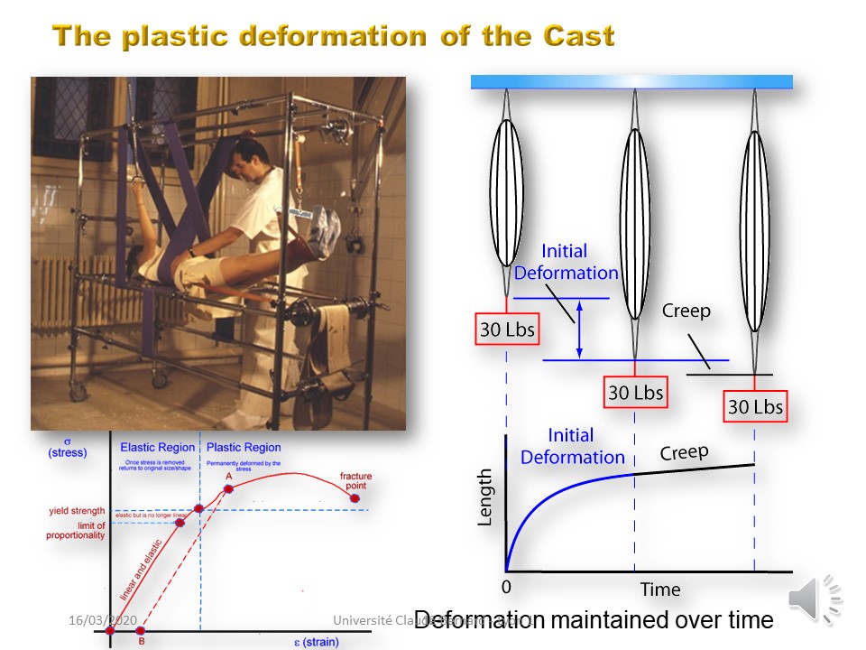 To restore Tensegrity in spine deviations, the length of the ligaments must be changed. This is why the characteristic of Lyon conservative treatment is the creep, that is to say the plastic deformation or change of length of the viscoelastic paravertebral structures (geometric non-linearity). The creep requires a continuous tension of 1 to 4 months, ie a “total time” of cast or brace. |