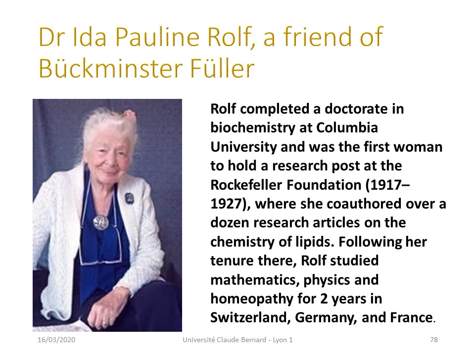 Dr Ida Pauline Rolf was a friend of Bückminster Füller. Rolf completed a doctorate in biochemistry at Columbia University and was the first woman to hold a research post at the Rockefeller Foundation from 1917 to 1927, where she coauthored over a dozen research articles on the chemistry of lipids. Following her tenure there, Rolf studied mathematics, physics and homeopathy for 2 years in Switzerland, Germany, and France. |