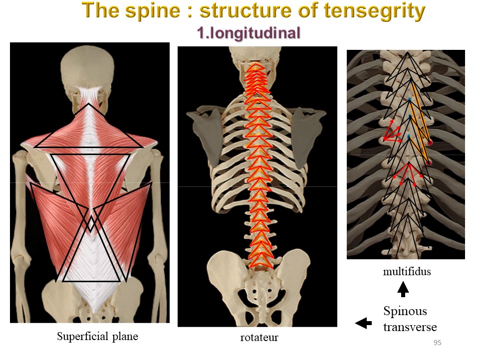 The entire muscular architecture, here clearly visible, is of triangular type. The apex of the kyphosis constitutes the peak of an icosahedron characteristic of a tensegrity structure. |