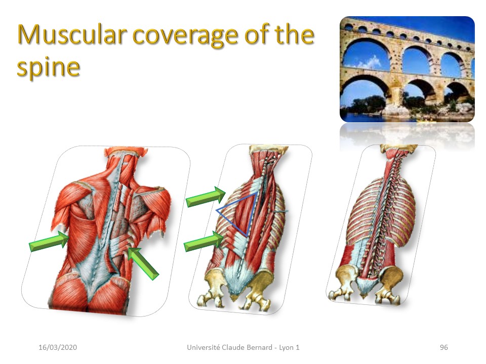The basis structure is the triangle which offers a best stability, but the muscle structure paravertebral as deep as superficial has a triangular structure. The posterior arch has a triangular structure with transverse apophysis and median spinous apophysis. |