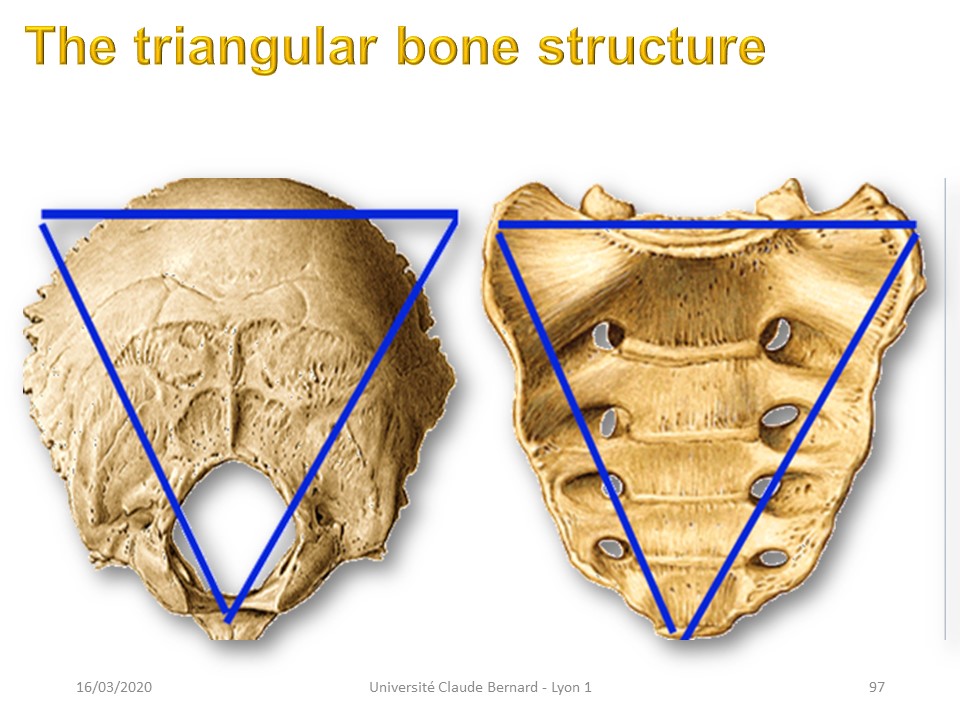 The point of insertion of the muscle chains at the ends of the spine is triangular, ensuring the stability of the head at its upper end and the relay with the lower limbs at the level of the sacrum. It is this stability that ensures us a functional bipedalism. |