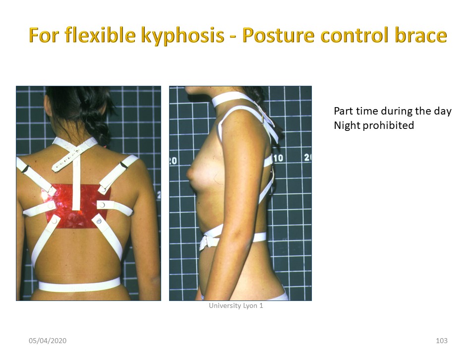 The soft corrective postural back brace can be useful when kyphosis is flexible and in addition to physiotherapy. They have the disadvantage of being passive whereas one wishes on the contrary to stimulate the postural mechanisms of self-correction. |