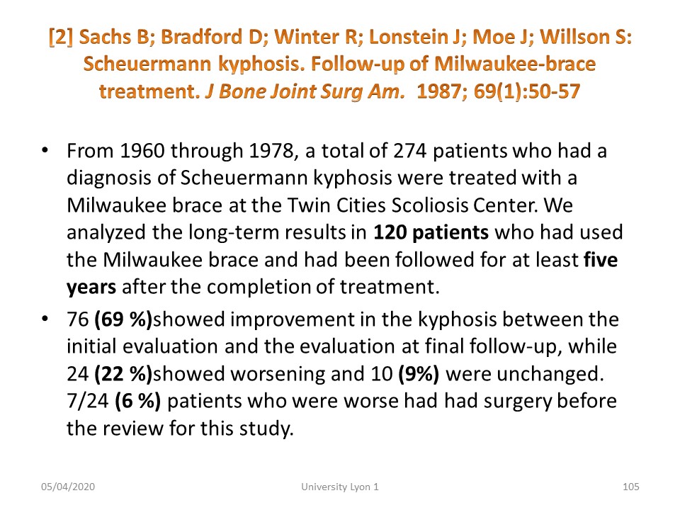 Few results are published in the literature. Sixty years ago, kyphosis was treated with the Milwaukee brace. Nearly 70% of patients improved. |