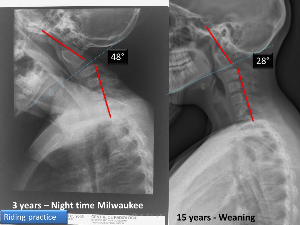 In this exceptional case of posterior agenesis C1-C2, with progressive hyperkyphosis C2-C3 of 48 °. the night Milwaukee brace was chosen from 3 years to 15 years. |