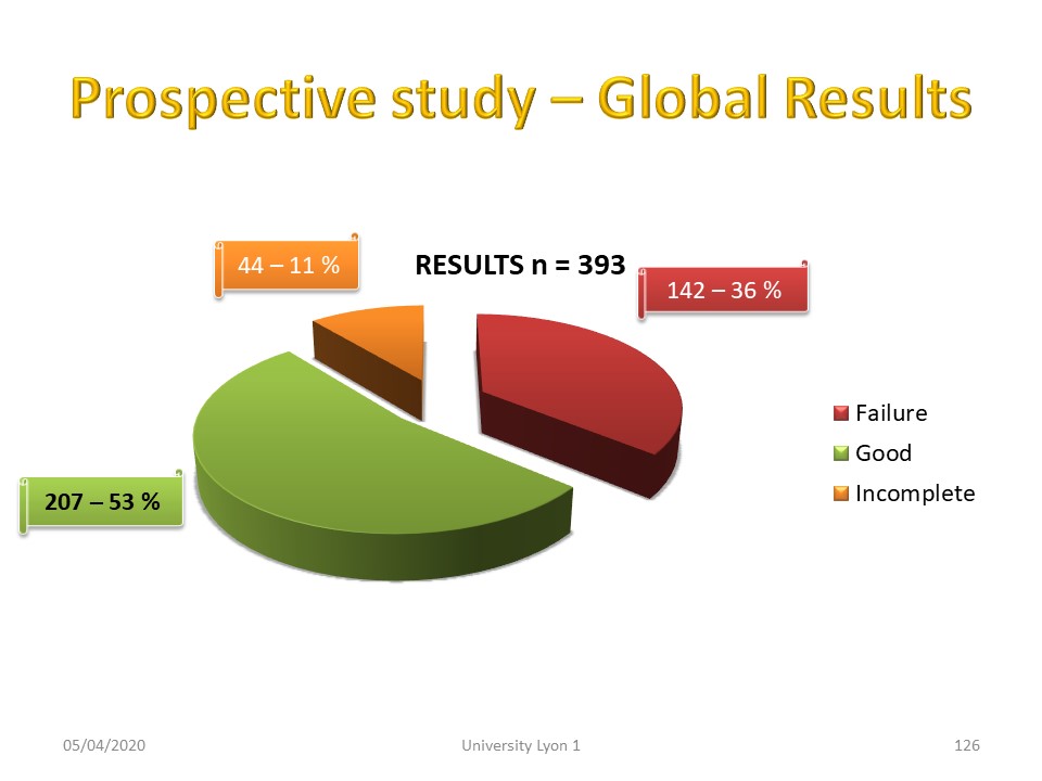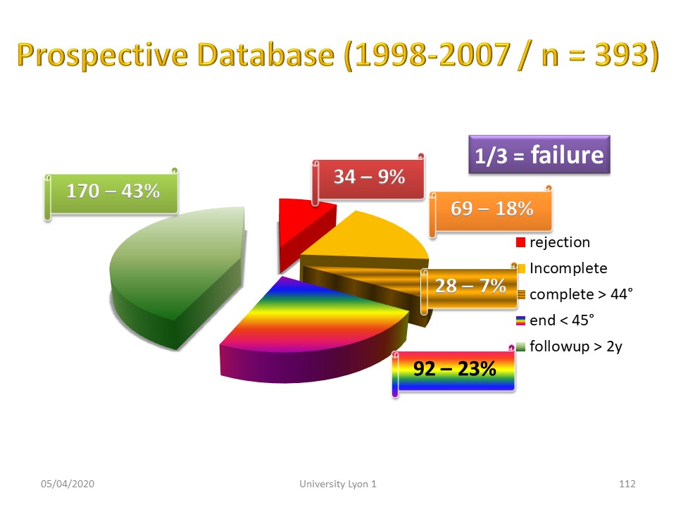 Interpretation of the results is difficult in kyphosis. Globally nearly 80% of patients have an angulation of less than 45° at the end of treatment, i.e. a quasi-physiological angulation. |