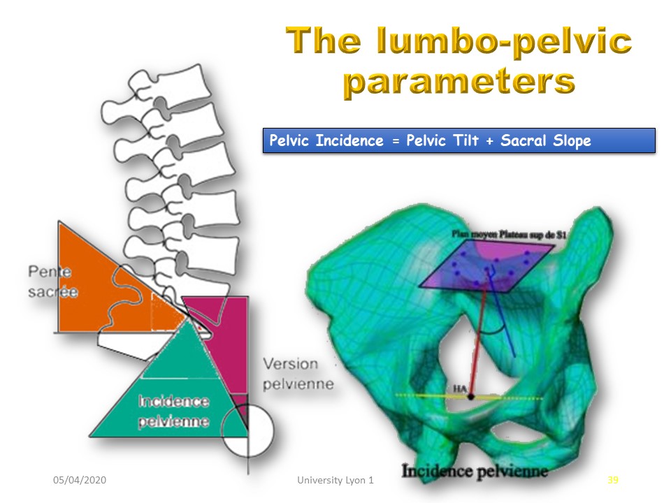The lumbo-pelvic parameters were defined in a second step by Mrs. Duval-Beaupère. Pelvic incidence is a constitutional parameter. The sacral slope is correlated with lordosis. The adjustment is made by the pelvic version. The pelvic belt must take these parameters into account. |